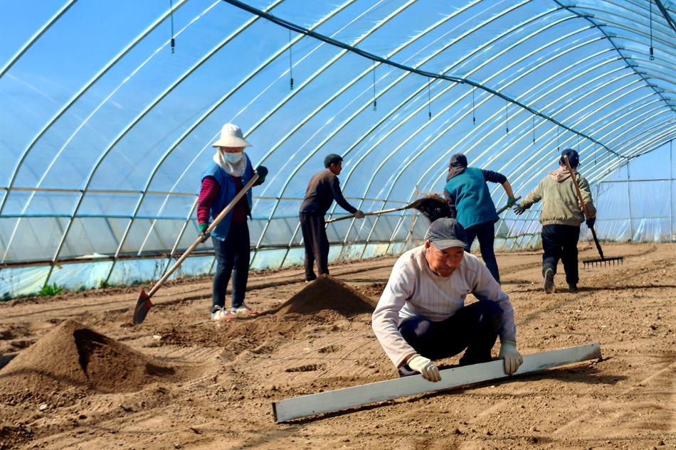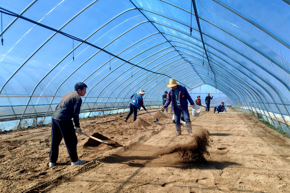 春日的大地,处处充满希望,记者走进土门镇下赵村万寿菊育苗基地,眼前一派繁忙的景象。数十座大棚整齐排列,大棚内农民们手持铁锹、锄头、耙子等农具,正忙着进行整地、播种等工作,为提高播种质量奠定好基础,也为种子萌芽出苗创造适宜的环境。