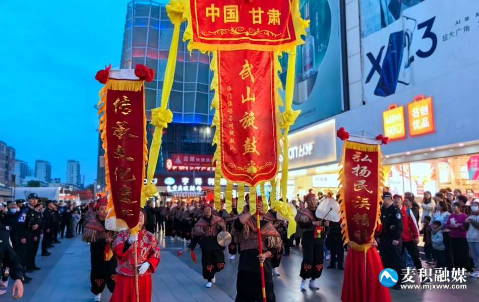 随着非物质文化遗产“旋鼓舞”雄浑悠远的声调响彻步行街,演出正式拉开帷幕。表演者身着节日盛装,手持鼓槌,边敲边舞,铿锵的鼓点、精湛的技艺、饱满的热情,让现场观众感受到了武山旋鼓舞的魅力。
