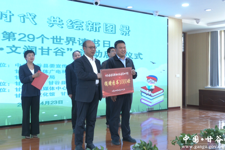 仪式上,宣读了《甘谷县2024年全民阅读倡议书》《甘谷县“绿书签行动”倡议书》,县图书馆向甘谷四中捐赠图书1000余册,不仅充实了学校阅读资源,也有效引导了青少年学生树立爱读书、读好书、善读书的校园风尚。