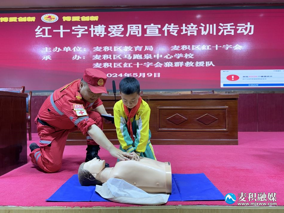 新天水讯 据麦积区融媒体中心消息 为庆祝第77个“世界红十字日”,提升师生安全应急和日常急救能力,近日,麦积区教育局联合麦积区红十字会在马跑泉中心学校开展红十字博爱周宣传培训活动。