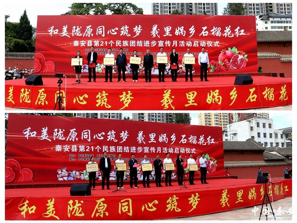 仪式上,县委副书记、统战部部长姚建国作了致辞并宣布全县第21个民族团结进步宣传月活动启动;县委常委、宣传部部长马昊莹宣读了《秦安县第21个民族团结进步宣传月活动实施方案》,县人大常委会副主任、县总工会主席任云飞宣读了《关于命名第九批全省民族团结进步示范区示范单位、第一批全省“红石榴”各族群众互嵌式发展示范单位、第五批全市民族团结进步示范区示范单位的决定》;县政府副县长郑博主持活动;出席领导为陇城镇、教育局、劳务输转服务中心等13个示范区示范单位授牌。