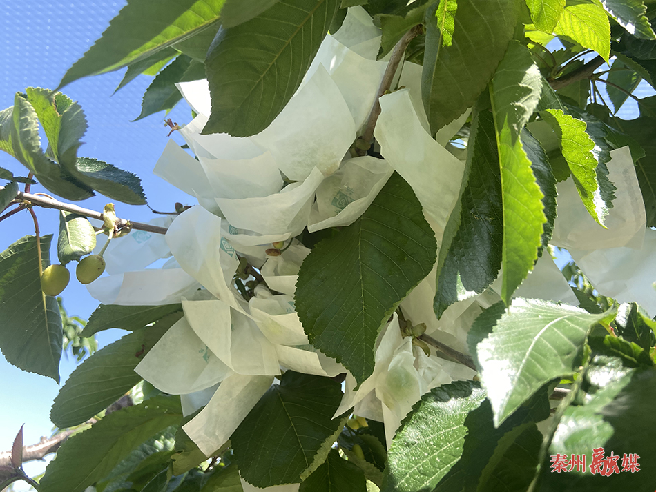 在大樱桃结果初期,给一颗颗樱桃套上小纸袋,可以起到樱桃病虫害防治的作用,让生长期变长,产出的大樱桃不仅色泽鲜亮、果个大、品相好,吃起来比普通的大樱桃更甘甜可口,还可以延长大樱桃的采摘和销售周期。