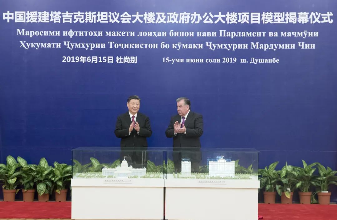 2019年6月15日,国家主席习近平在杜尚别同塔吉克斯坦总统拉赫蒙共同出席中方援塔议会大楼、政府办公大楼项目模型揭幕仪式。新华社记者 王晔 摄