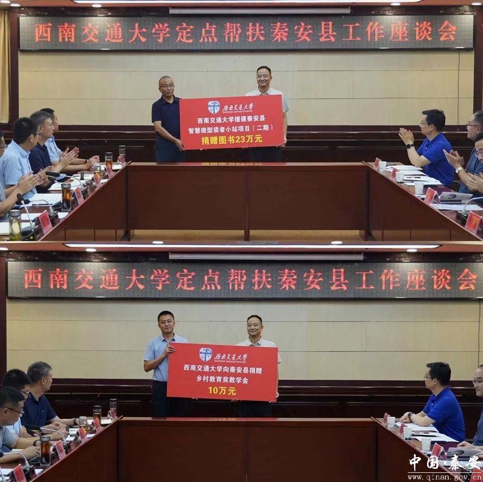 在召开的西南交通大学定点帮扶秦安县工作座谈会上,举行了西南交大援建秦安县智慧微型读者小站捐赠仪式和西南交大向秦安县捐赠乡村教育奖教学金仪式,县委书记周济作了致辞,余敏明作了讲话。县委副书记、县长王龙强主持会议,县领导姚建国、杨成、胡继仁、章春军、郑博、陈元定及县直相关部门、单位和相关镇主要负责人参加会议。