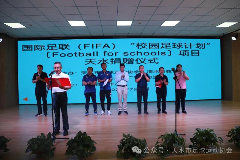 新天水讯 据清水县融媒体中心消息 7月9日,国际足联(FIFA)“校园足球计划”(Football for Schools)项目,天水市4号足球捐赠仪式在清水县西华小学举行。天水市足协主席金世存,清水县人民政府副县长金学民,天水市足协秘书长胡博、副秘书长朱作成出席捐赠仪式,参加活动的有县教育局、县文旅局负责人及西华小学在校师生。