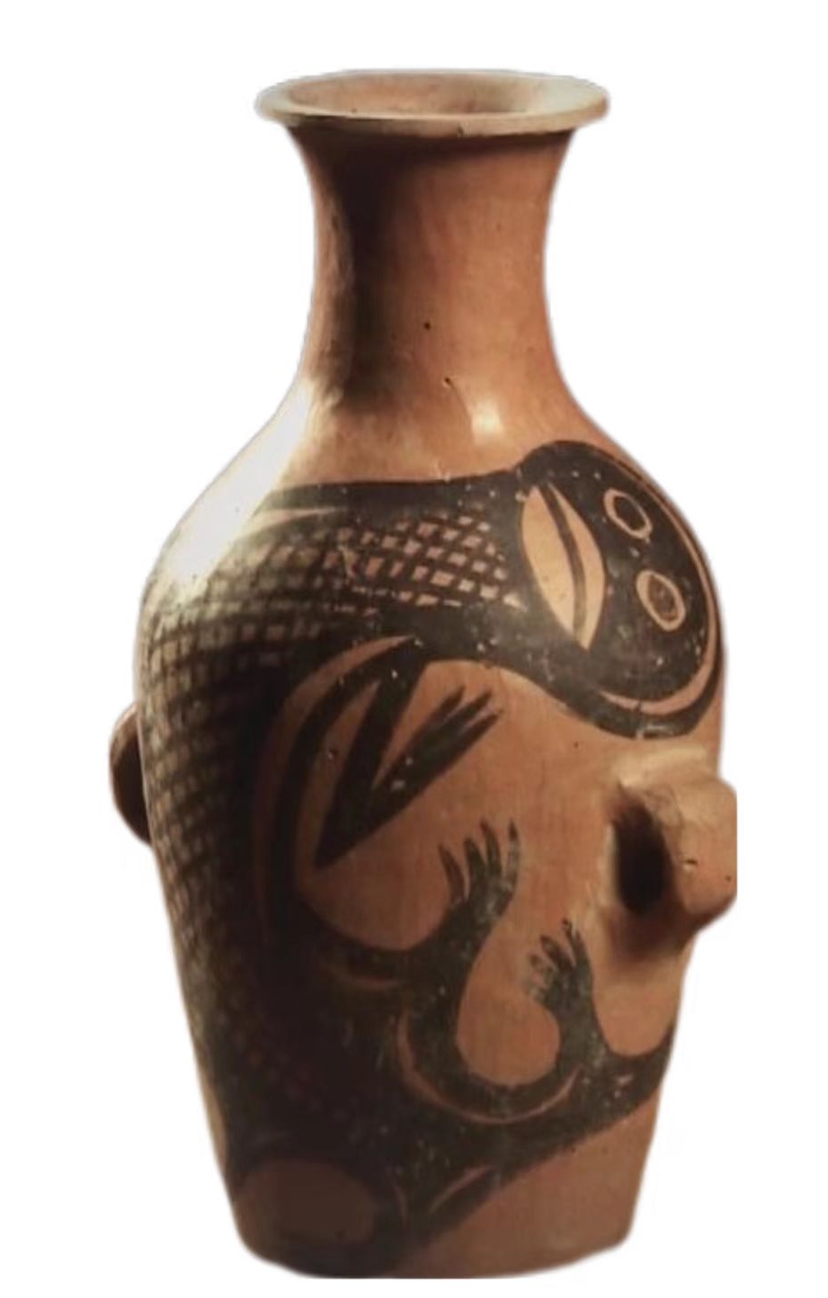 这件鲵鱼纹彩陶瓶为泥质红陶,高18.5厘米,口径宽5.7厘米,底径7厘米,腹径14厘米,重430克。陶瓶最显著的特征是在腹部绘有动物图纹。动物的身子呈蜷曲状,尾巴向上翘举,交于头上。脸似人面,双眼圆睁而有神。嘴巴宽阔,颚下有须,头顶两侧有伸出的节肢状腮。奇怪的是,它只有一对前肢,肢端有张开的四肢。陶瓶身上绘制有网格状的线纹。线条流利而生动,变化丰富,展现出了熟练自如的绘画技巧。从鲵鱼图案的绘制来看,纹饰用笔锋画作的线条遒劲有力,顿挫有致。粗细不同的线条之间,还凸显出了图纹部位的主次。彩陶的出现,也似乎在见证着先祖们在荡淅离居、不常厥邑的岁月中所经历的那些艰难生活。
