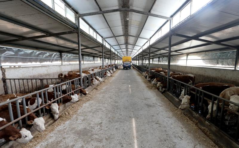 走进黄门镇台子村嘉泰牧业园区,一排排圈舍有序排列,除菌室、配药室等功能室一应俱全,工人们正清理牧区杂草,圈舍内草料运输车来回穿梭,成群的牛正津津有味地吃着草料,现场一片繁忙景象。