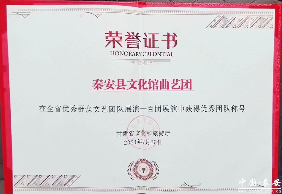 新天水讯 据秦安县融媒体中心消息 7月29日,甘肃省优秀群众文艺团队展演——“百团汇演”暨“歌唱祖国”大家唱群众歌咏活动在平凉崆峒区绿地广场举行。秦安县文化馆曲艺团被省文旅厅授予全省优秀群众文艺团队展演——百团展演优秀团队称号。