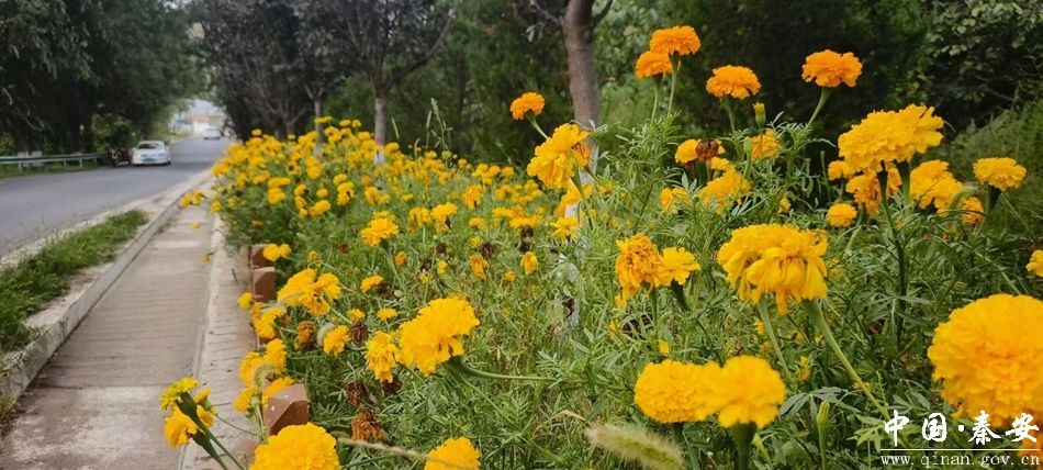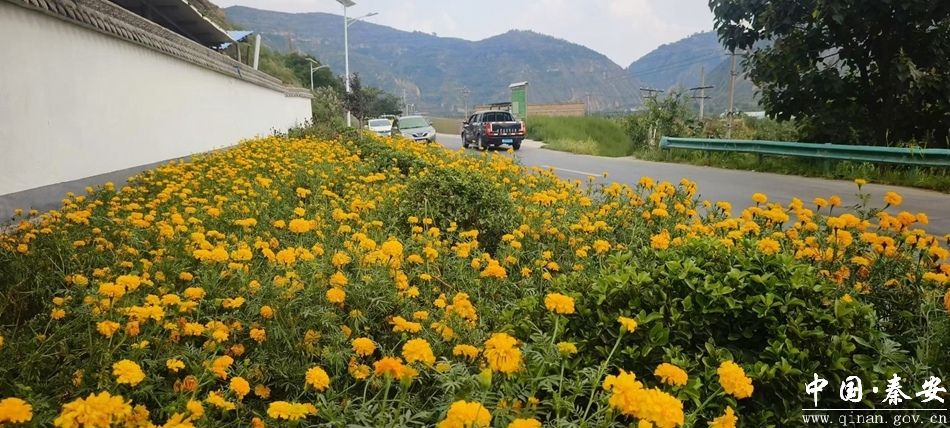 新天水讯 据秦安县融媒体中心消息 当前,秦安县叶堡镇靖天路段栽种的万寿菊花开繁茂、花大色艳,不仅美化了靖天公路沿线环境,还扮靓了和美乡村。