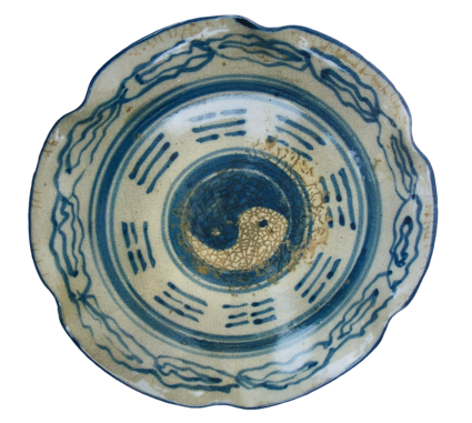 北宋蛋青釉荷叶型蓝宝石矿料青花八卦太极云洗。据他回忆,是二十世纪末甘谷盘安镇刘家墩的村民在取土时偶尔发现的。洗,是一种盛水洗笔的器皿,属文人用品。器的口径23cm,坐底径8cm,高6cm。方内画阴阳太极八卦如意吉祥云纹图。最醒目的是,洗内双龙缠绕,恍如“伏羲女娲交尾图”的雏形。令人称道的是,这件瓷洗,画技大胆,内容丰富。尤其是云、卦、太极鱼三层图景,寓意着天、地、人协调统一,和谐自然。其釉色历经千年仍十分玉润铮亮,完美无缺,底口泥胎,胎质黄褐色泛红,十分精美。