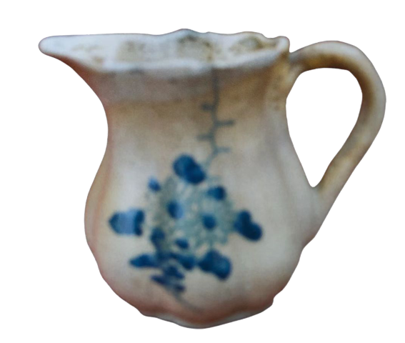该口杯高10cm,上口手捏黏泥接连,珍珠釉浇注粘连处留有数滴珍珠釉泪珠。口沿前倾,连口粘痕明显裸露。通体呈吊南瓜分棱,八道指泥壕显八股棱条。造型珍珑灵秀,珍贵之处在于上施浅玛瑙釉,体面使用蓝宝石矿料画一束盛开的菊花。画笔娴熟简练,富有立体感,且活灵活现。在背面腰中部,用淡青花题“□□”二字,字虽模糊不清,但胎土细腻,瓷壁轻薄又坚硬如骨,胎底色黄中泛红,瓷体表面青釉中又泛小针褐色点。把手处,窑变为蚯蚓走泥纹。这种泥纹,沉重古朴,明亮而深沉,是釉层在干燥或烧成时发生干裂,后在高温阶段又有釉流入填补而形成的。在民国以前,蚯蚓纹曾被作为判断钧釉的唯一标准。