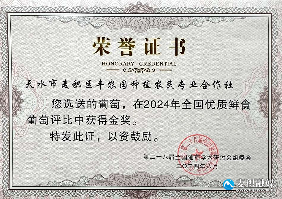 新天水讯 据麦积区融媒体中心消息 8月21至23日,中国农学会葡萄分会第二十八届学术研讨会在广西桂林兴安县举办。期间,在全国优质鲜食葡萄评比中,由麦积区丰农园种植农民专业合作社选送的黄金蜜新品种获得金奖。新品种获奖为进一步提升麦积葡萄知名度和影响力将发挥积极作用。