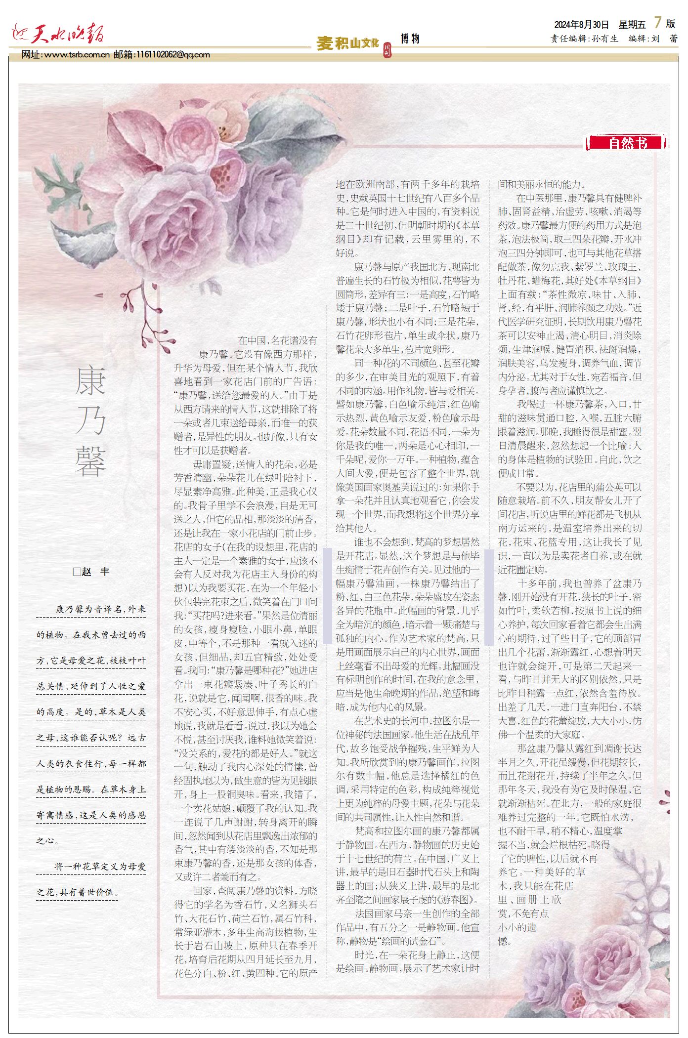 我喝过一杯康乃馨茶,入口,甘甜的滋味贯通口腔,入喉,五脏六腑跟着滋润。那晚,我睡得很是甜蜜。翌日清晨醒来,忽然想起一个比喻:人的身体是植物的试验田。自此,饮之便成日常。