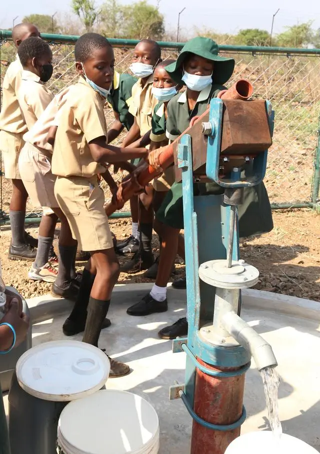 △2021年11月,在津巴布韦南马塔贝莱兰省省会关达的塞农多小学,学生从中国援建水井里打水。