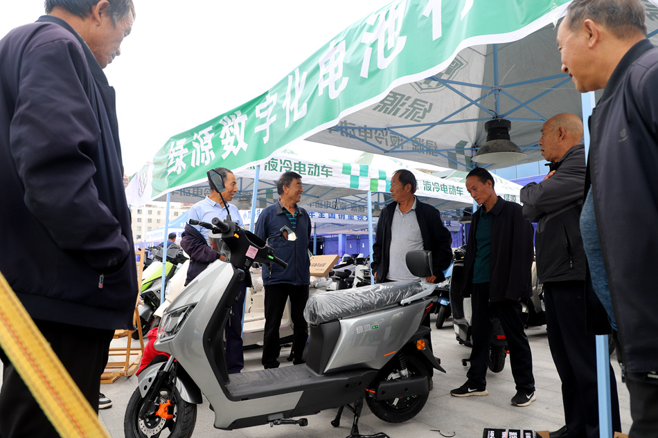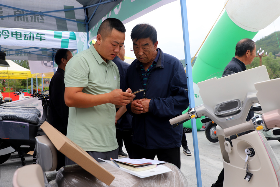 来到清水县轩辕广场,县内十余家电动车、家电家装等门店设立了展示专区,进行现场宣传销售,悬挂的“以旧换新,政府补贴”横幅十分醒目,吸引不少市民前来咨询购买。