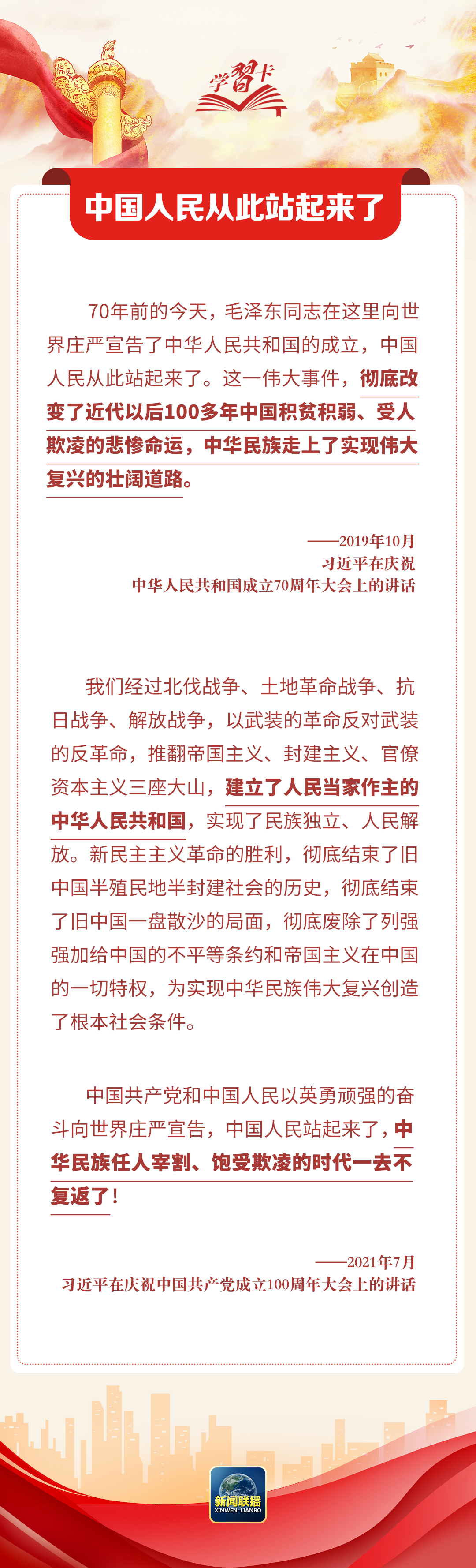 75年前的今天,中国共产党和中国人民以英勇顽强的奋斗向世界庄严宣告,中国人民站起来了。75年来,中华民族迎来了从站起来、富起来到强起来的伟大飞跃。