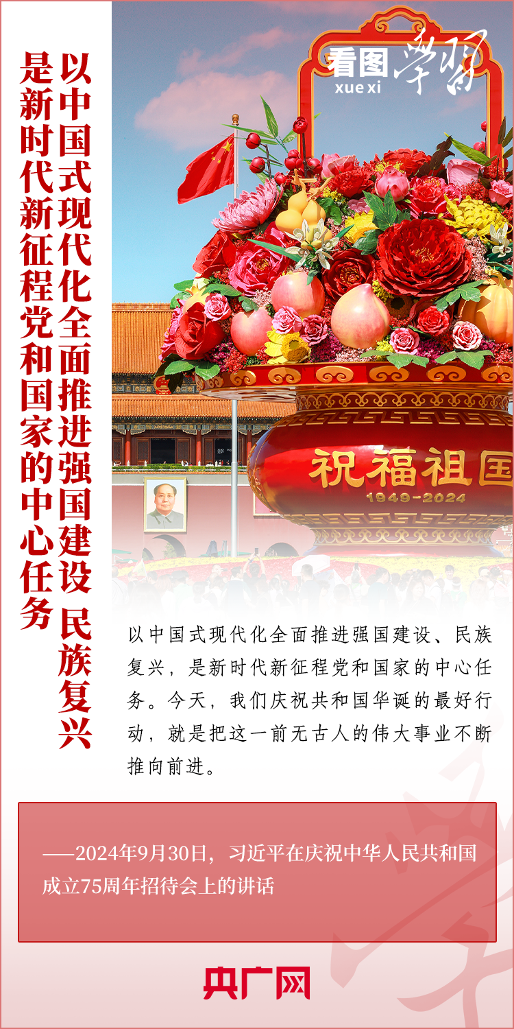 “经过75年的艰苦奋斗,中国式现代化已经展开壮美画卷并呈现出无比光明灿烂的前景。”9月30日,庆祝中华人民共和国成立75周年招待会在京举行。习近平总书记出席招待会并发表重要讲话。总书记强调,以中国式现代化全面推进强国建设、民族复兴,是新时代新征程党和国家的中心任务。我们庆祝共和国华诞的最好行动,就是把这一前无古人的伟大事业不断推向前进。