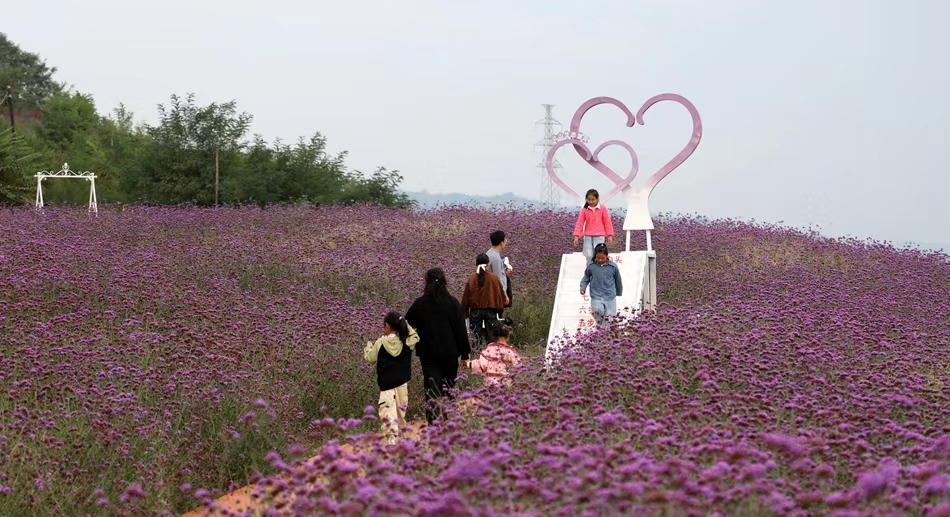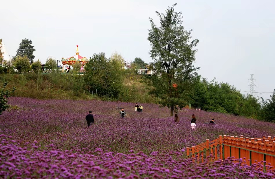 在北山生态景区,紫色的马鞭草、薰衣草依旧灿烂绽放,笑迎八方游客。如梦如幻般的紫色花海以及各种游玩设施吸引了不少市民游客在此驻足,拍照打卡,并且通过社交朋友圈分享这份假日的美好。