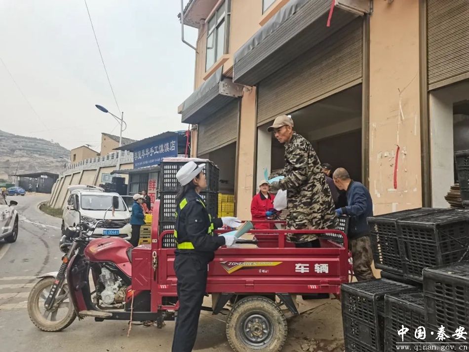 新天水讯 据秦安县融媒体中心消息 又到了一年苹果丰收季,我县苹果进入采摘季,务农务工群众出行繁忙,农用车使用频繁,为进一步提升农村地区交通参与者(务农务工群众)的交通安全意识、规则意识、法制意识和文明意识,切实做好苹果销售季节交通安全宣传工作,全力预防和减少农村道路交通事故。10月9日,秦安县公安局交警大队组织宣传民辅警走进辖区兴国镇上门开展交通安全宣传教育,为交通参与者(务农务工群众)送上交通安全“大礼包”,让交通安全知识深入群众心中。