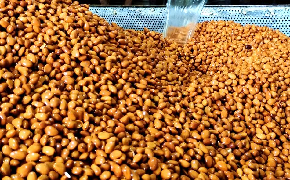 近日,记者走进天水幸福里土特产开发有限公司的生产车间,在轰鸣的机器声中,一股浓郁的松果香气扑鼻而来。松子加工生产线上,两台松果脱粒机飞速运转,一颗颗饱满的松子源源不断地从筛选机中倾泻而出,然后跌落在传送带上。工人们则熟练地进行着漂水、烘干、分拣、包装作业,车间内繁忙而有序。