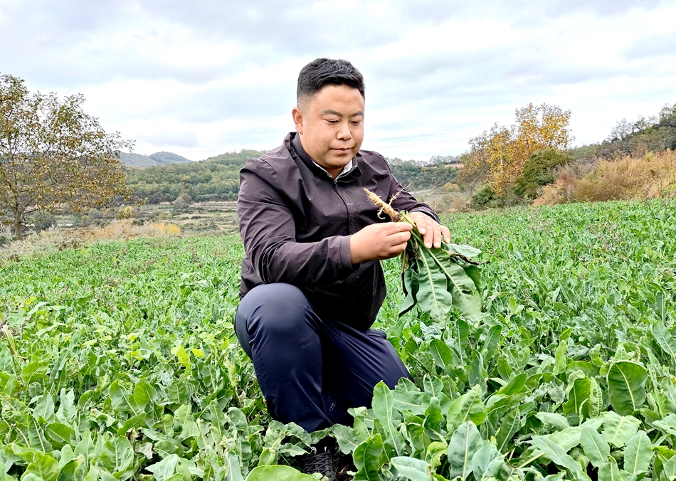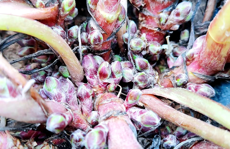 在兴坪村款冬花种植基地里,清水县杏林药材种植农民专业合作社负责人李国平正在药材地里察看款冬花的长势,他双手掀开款冬叶子,紫色的款冬花蕾清晰可见,簇拥在药材根部,目前仍在生长期,立冬后便能迎来丰收。