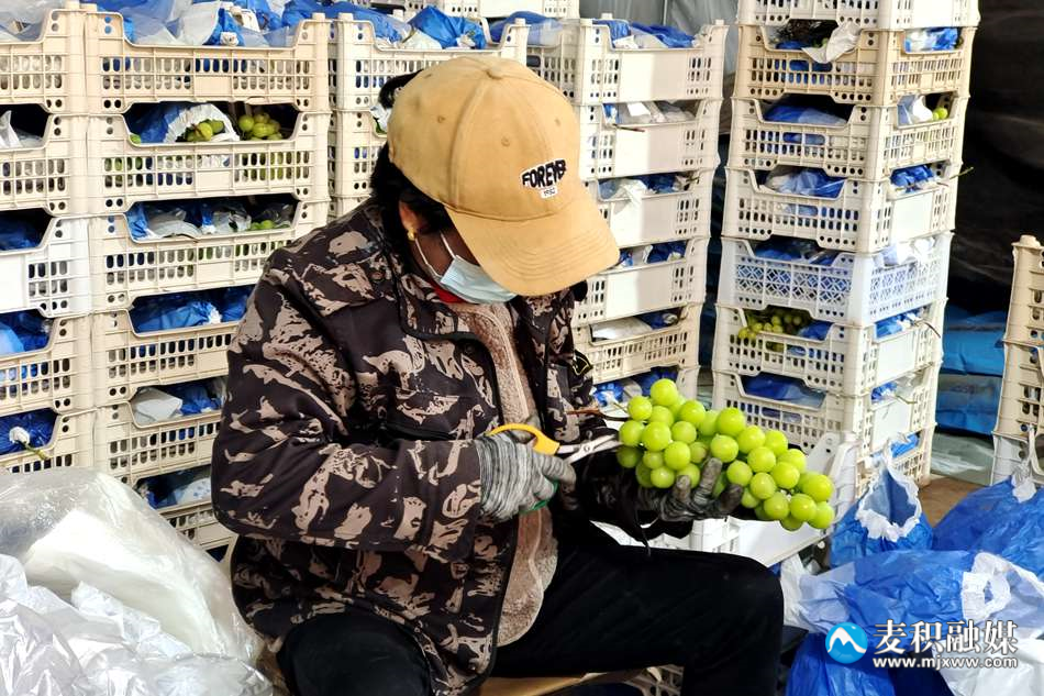 村民税红珍说:“我每天的工作是给‘阳光玫瑰’葡萄分等级,最大的果子能达到一斤半到两斤,分为三种等级,最小的为散果。我每天能装70到80筐,都是经过精心挑选的。”