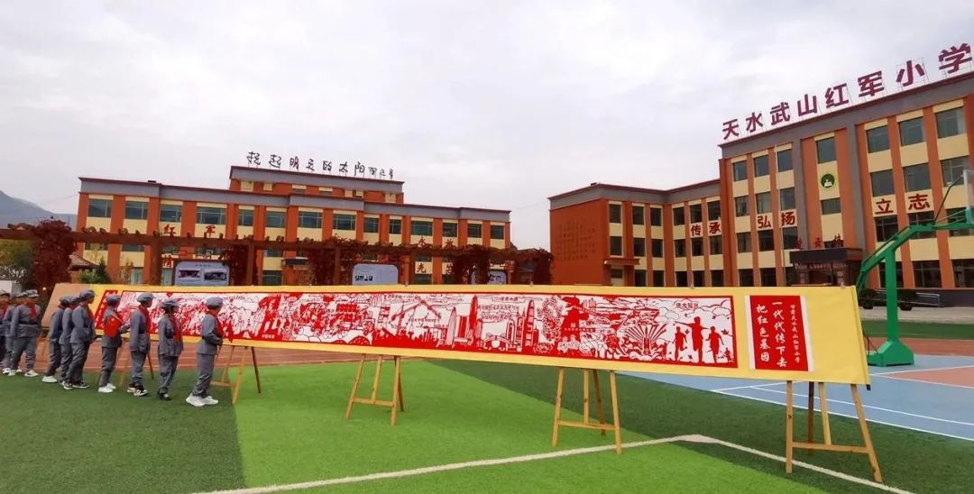 “武山是一片红色的热土,红一、红四方面军先后途经鸳鸯,留下了许多革命遗存。”非遗剪纸传承人刘吉平经常被邀请到各学校为学生们上剪纸课,他特别喜欢以红色文化为题材进行创作。“这两幅剪纸长卷以红色为主题,加入武山红色资源元素,从设计、定稿、刻制、装裱,深深融入了全校师生对党、对国家的无限热爱。通过非遗与红色文化的结合,一方面传承非遗文化,另一方面让大家以更加直观的方式弘扬红色精神、赓续红色血脉,从而汲取奋进力量。”刘吉平说。