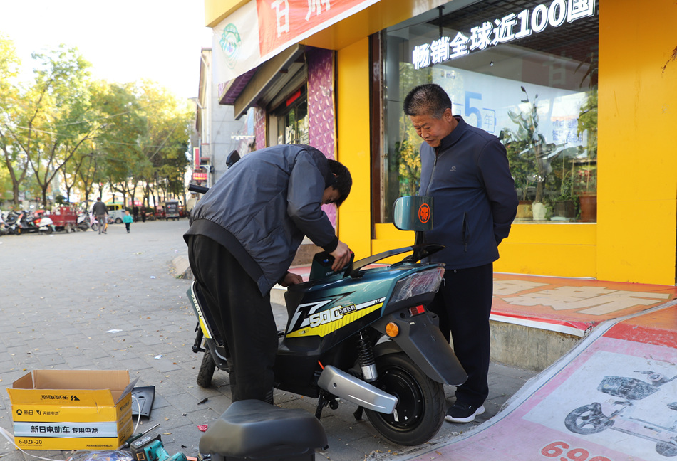 在清水县泰山路新日电动车门店,工作人员正在为顾客新购的电动车安装电池及配件,叮嘱顾客驾驶过程中的注意事项以及后续保修保养相关知识。