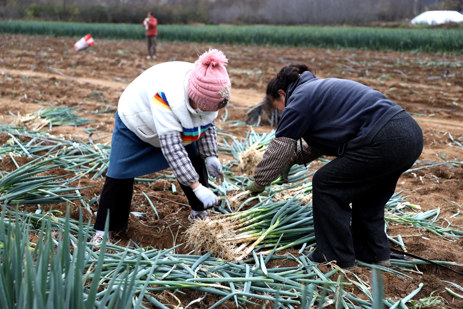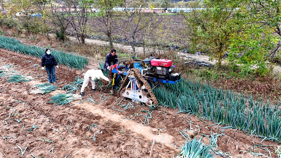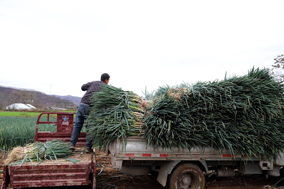 11月18日,记者来到温沟村的大葱种植田,伴随着大葱自动收割机的轰鸣声,一排排葱白莹润、粗细均匀的大葱连根拔起,现场10余名村民熟练有序地收葱、捆扎、搬运、装车,田间地头一派好“丰”景。