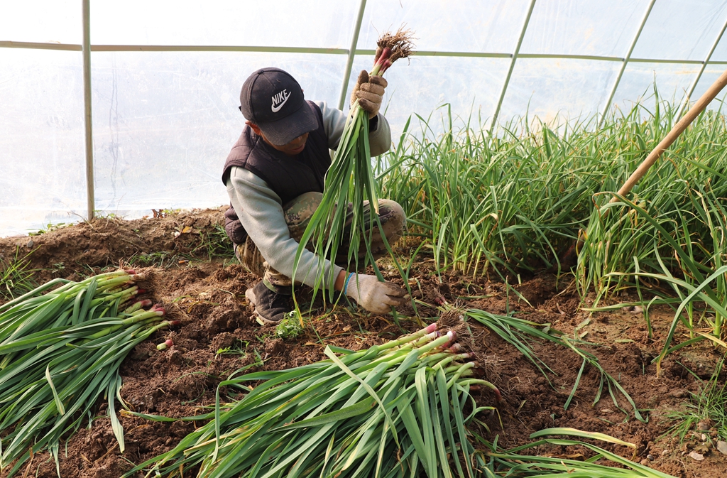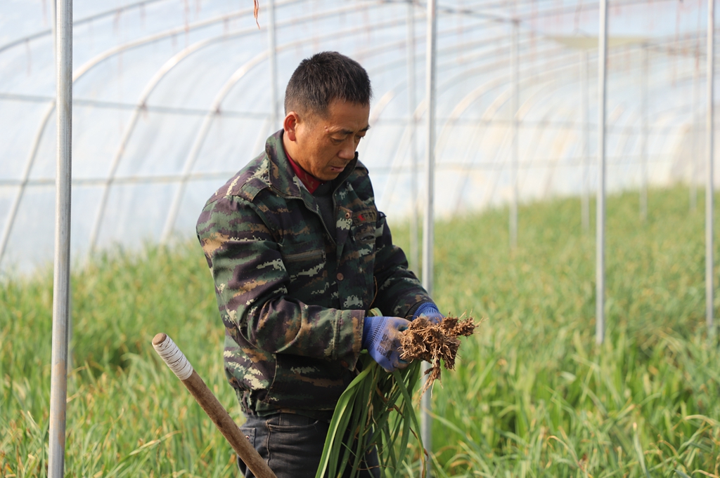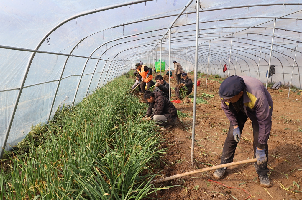 在隔壁大棚,其他村的乡亲蒜苗也挖得热火朝天。
