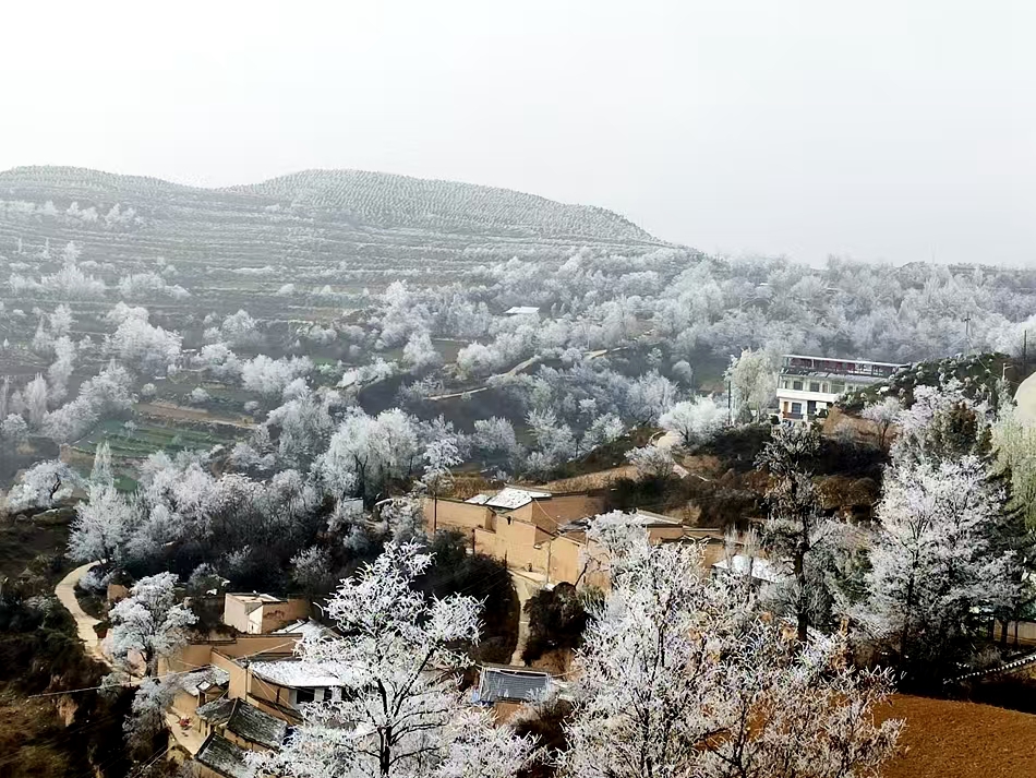 武山县龙台、山丹、滩歌、马力镇的山峦及村庄被白雪覆盖,云雾缭绕中若隐若现,宛如仙境。山上的树木像是被大自然精心雕琢的艺术品,树枝上挂满了晶莹剔透的雾凇,似霜似冰,在阳光的照耀下闪烁着钻石般的光芒,构成了“千树万树梨花开”的绝美画面。