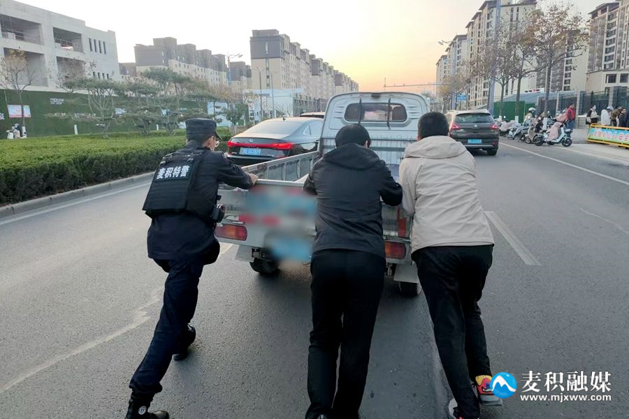 11月21日17时31分许,反恐大队民辅警在某学校门口开展“护学岗”工作时,发现一辆小货车突然抛锚,停在了主干道中间,导致交通拥堵。反恐大队执勤民辅警迅速反应,立即上前疏导交通,指挥车辆有序绕行,避免造成更大范围的堵塞。后快步来到抛锚车辆旁,查看车辆状况,经了解,车辆因不明故障无法启动。执勤民辅警在确保周边安全的情况下,齐心协力将抛锚车辆推至路边安全地带,快速恢复交通秩序,确保师生安全有序通行。