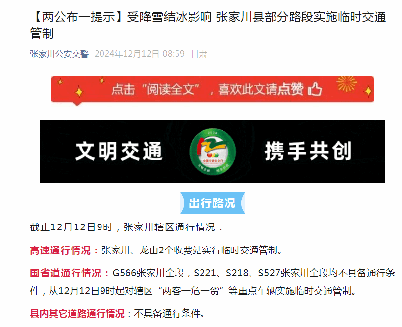 通过“两微”及短信平台,及时发布天气预警、交通安全“两公布一提示”等相关信息,及时提醒驾驶员注意冰雪恶劣天气行车安全,引导车辆缓慢、有序、安全行驶,同时,积极对过往驾驶员宣传雪天行车注意事项,最大限度提高道路通行能力,全力保障辖区群众出行安全。