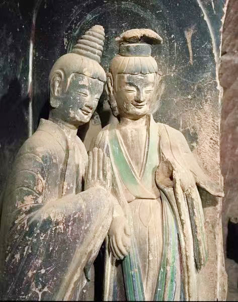 经过了千余年风霜雨雪的打磨,麦积山石窟第44窟坐佛显得特别温润。在漫长时光的洗礼后,它显示出一种淡妆素抹的感觉,微微含笑,更显得亲切温婉,有“东方的微笑”之誉。麦积山石窟第121窟的一组泥塑造像,菩萨与弟子也是双眸细眯、嘴角上扬,窃窃私语、微笑迷人。菩萨与弟子头靠头、肩并肩,菩萨仿佛在弟子耳边用喃喃细语教诲,弟子则是专心倾听,双手似开似合于胸前,貌似在对菩萨的教诲拍手叫绝。菩萨头束扇形高发髻,身穿宽松的交领连衣长裙,足穿云头履。弟子胸前的袈裟翻边,形成双领下垂状,两人装束尽显中原传统服饰风范……第133窟一尊只有半米高的小沙弥,在佛龛内靠侧壁站立,俯身看去,只见他低头微笑,鼻子稍大,更烘托其眼部的细和嘴部的微微翘起,表现出一种特别的憨态。如此的天真无邪,让每个参观者也不禁会心一笑。正是这些温情脉脉的东方微笑,成为了麦积山石窟标志性的“表情包”。