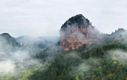 夏朗云:对,因为有这个自然景观的资源,也支撑了文化方面的资源丰富,这是一个大的方面。小的方面可谈一下丹霞地貌,它是处在秦岭一片葱郁的山区和黄土高原之间的丹霞地貌。红色的丹霞地貌,是绿色和黄色中间加上了一片红色,这个地貌就感觉非常的鲜明,是一种赏心悦目的、眼前一亮的这种小地貌。这是一种比较有特点的地貌,在别的地方少见,所以被国家命名为麦积山国家地质公园。另外可谈一下林区,麦积崖处在林区的氛围中,于是产生了“麦积烟雨”这种特殊的景观。雨季的时候,基本在夏秋两季,屡屡见云丝从葱郁的林木中缕缕地抽出来,然后汇集在麦积山前,变化多端,让人产生非常丰富的联想,形成“秦州八景”之首的景观,这也是它风景上的一个大特点。