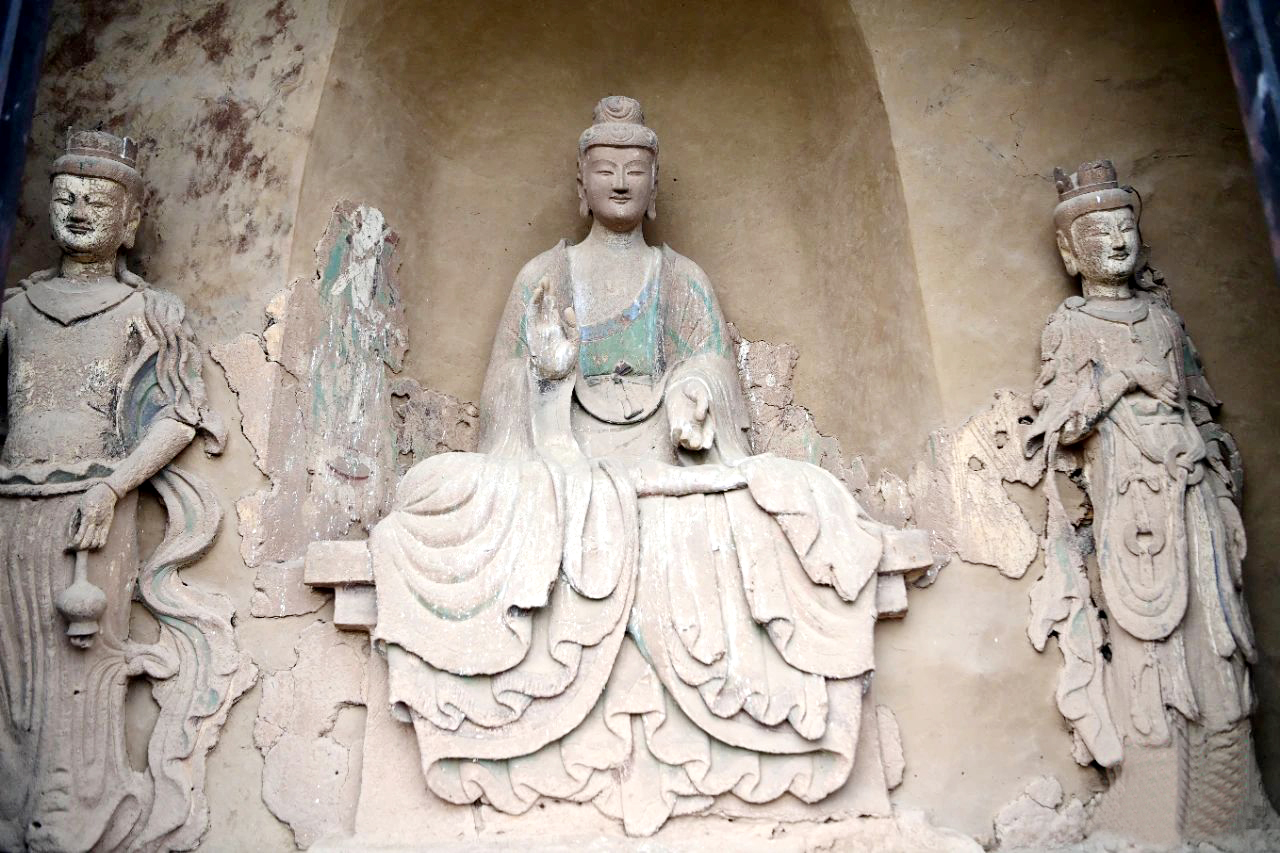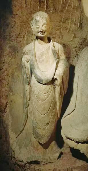 夏朗云:对,石雕还容易风化,泥塑在麦积山石窟内一般湿度大的环境里,千百年中风化程度似没有石雕大。我们看到的第44窟坐佛像的这种泥质如新,色泽就好像不久以前那样。但形态又不是太新,因为经过千余年风霜打磨,显得特别温润。如果太新的话,会感觉火气比较大,而如今却是超脱得不食人间烟火的那种感觉。就是说,面貌比较平和鲜活,是历经沧桑又脱颖而出的感觉,新和旧,古和今,形成统一体。所以说,坐佛像既是“生”的,意思是泥质如新,他又是“熟”的,意思是说经过古代风霜的洗礼,面部有些颜料已被打磨掉了,使其露出新鲜“生”的泥质。若颜料涂的多反而难看,就好像太浓的妆也不好。此坐佛,在千余年自然的洗礼后,有一种淡妆素抹的感觉,更加感人。其表情是秀骨清像类型中,加入丰腴女性化成分的淡妆素抹者,加之泥质的温润感,且微微含笑,显得更加温婉可亲,所以说它是麦积山石窟的一张名片。