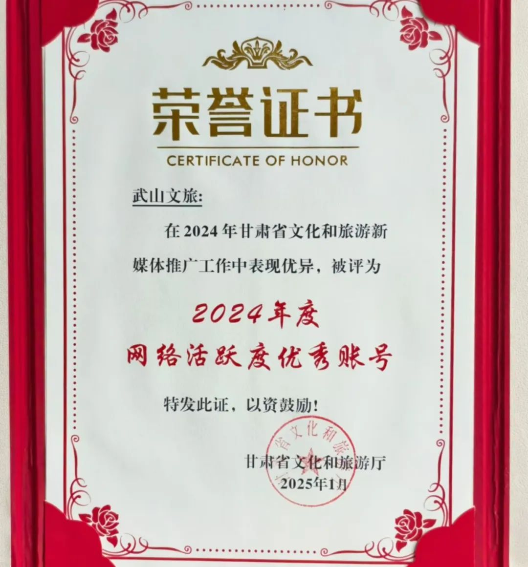 喜报|| “武山文旅”抖音号被甘肃省文旅厅评为2024年度网络活跃度优秀账号