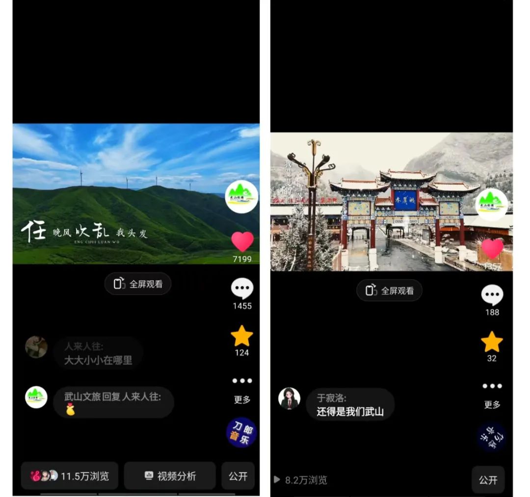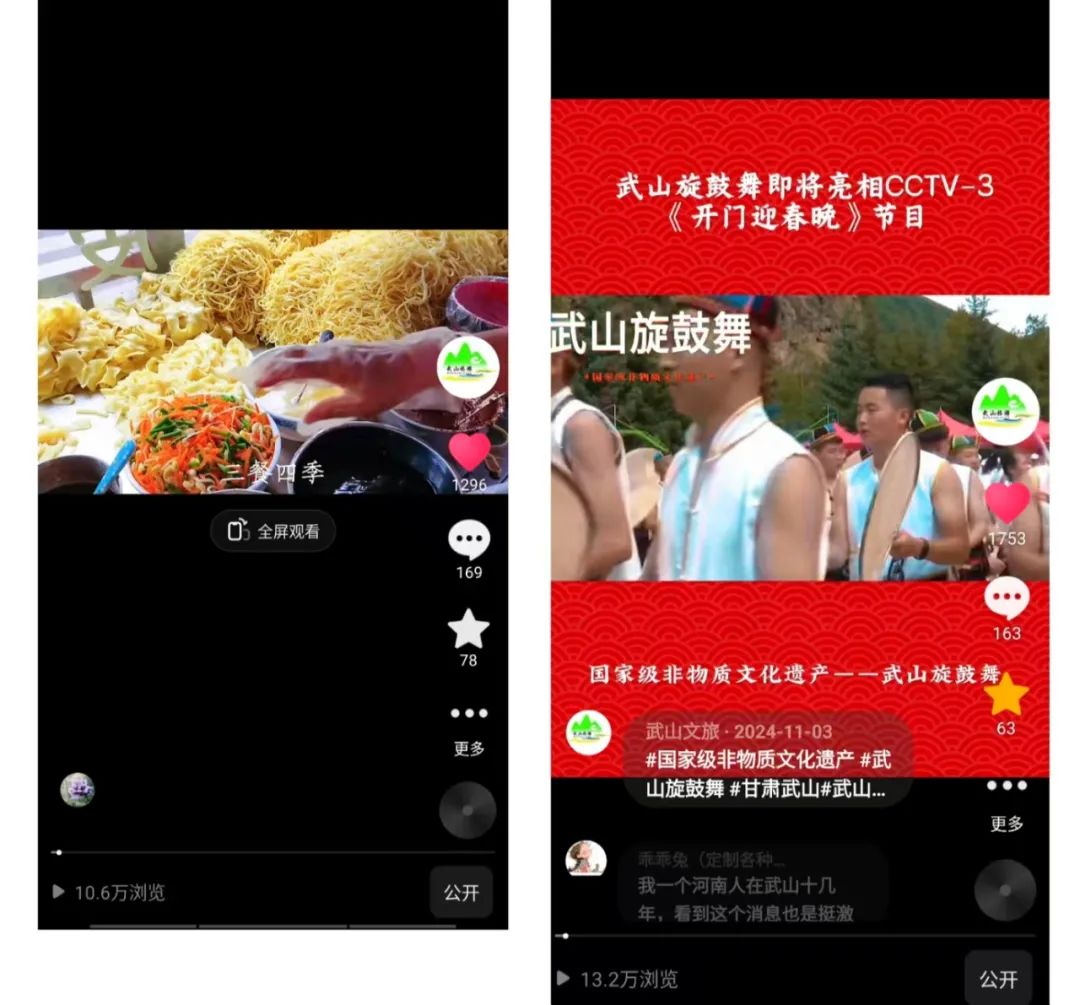 2024年全年,“武山文旅”抖音号共发布视频298条,综合浏览量超过600万次,其中10万+浏览视频11条,万以上浏览视频108条,单个视频最高浏览量37.8万次。另外,2024年5月武山文旅微信视频号正式上线运行,发布视频219条,视频浏览量达到180万次。全年武山文旅公众号发布宣传信息662条,被中央、省市官方媒体平台转发112条。强有力的宣传推介,全方位地展示了武山县浓厚的地域文化和秀美风光,全面提高了“武山十有”品牌的知名度、美誉度和影响力。