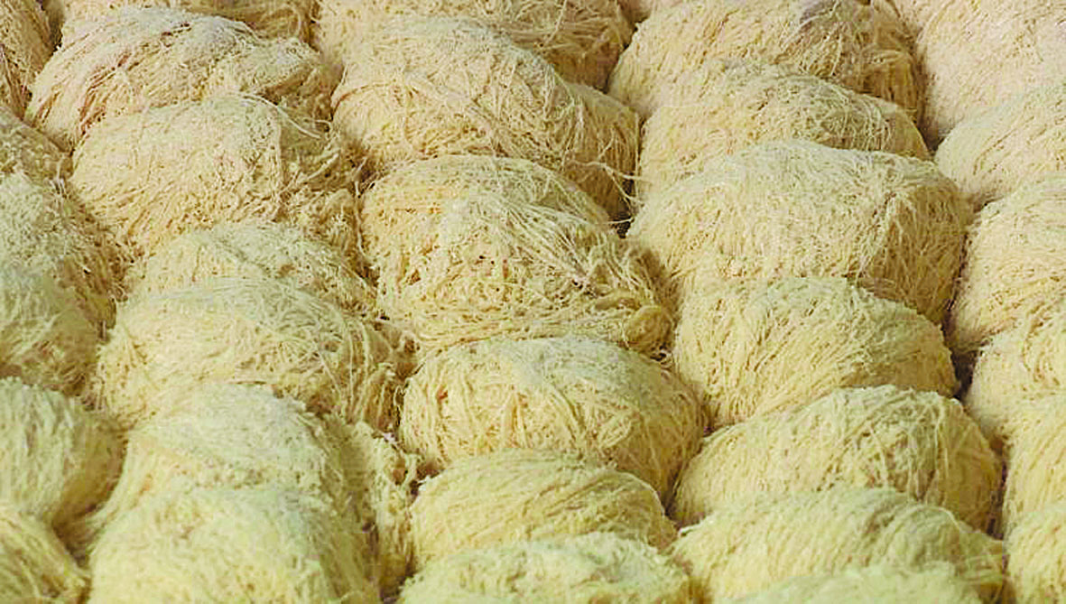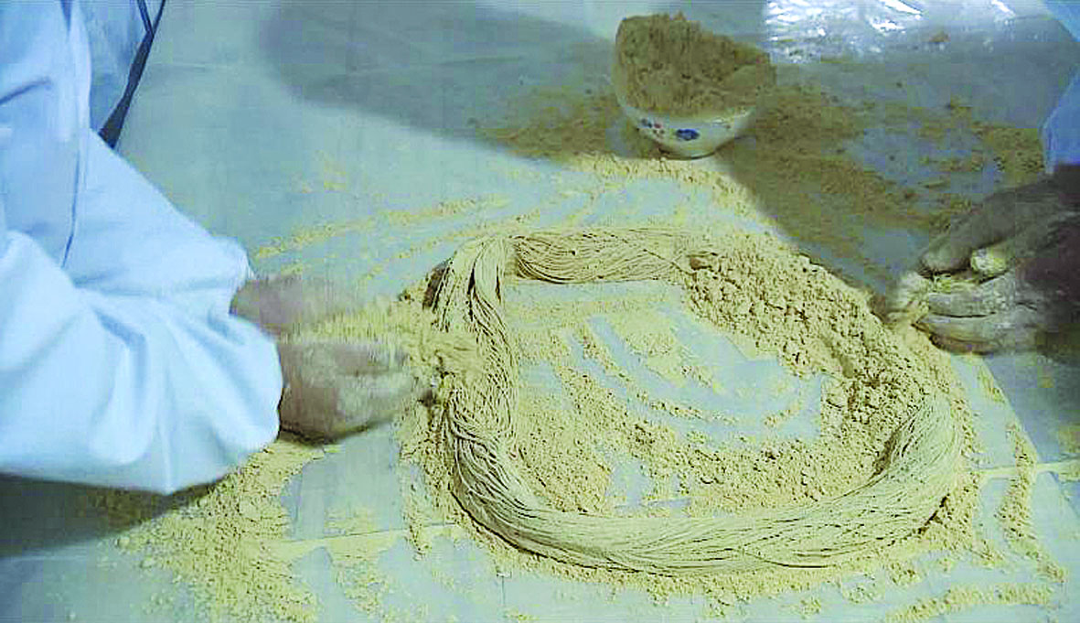 龙须糖的做法也很精妙。和其他地方所不同,石佛龙须糖在制作时要加入炒熟的豆子面,所用的热糖是从糖锅中直接舀出的稠糖稀,翻转、调和后,就能拔丝。有了豆面的参与,拉出的糖丝长若龙须,细密酥软,所以民间又叫酥酥糖。