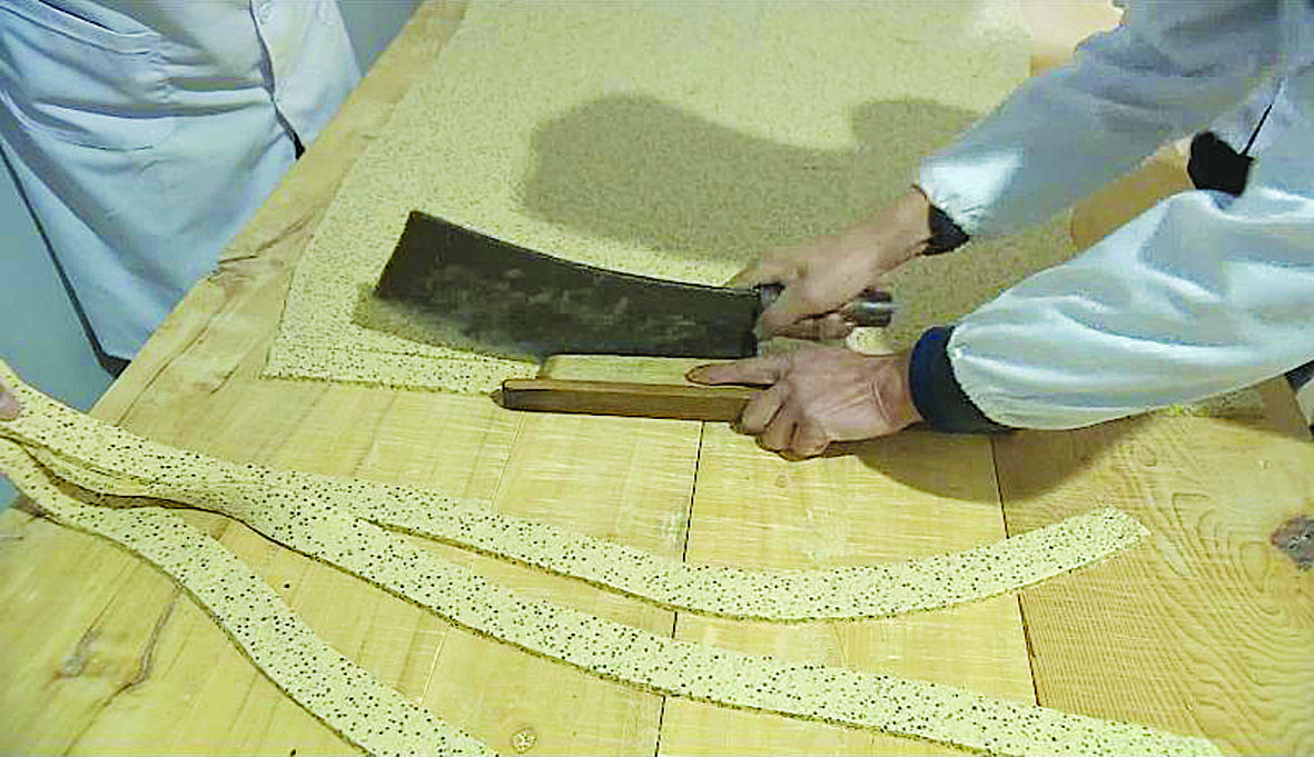 和一般的灶糖不同,石佛灶糖里的荏板糖是在热糖中加入一些优质的荏子制作而成的。荏子是中国北方广泛种植的一种油料作物,南朝医药大家陶弘景在《本草经集注》中记述,“荏状如苏,其子研之,杂米作糜,甚肥美,下气补益”。荏子香而不腻的味道,是北方人最喜爱的绿色食品。随着温度的提升,热锅中的荏子被慢慢烘干,散发出温糯的香味。当荏子和熬好的热糖奇妙地糅合后,就要被粗布包裹起来。一滚,再滚,像面团一样滚成方块,再经过擀、切,成为条状,这就是荏板糖。