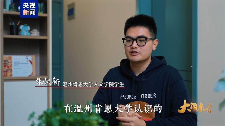温州肯恩大学人文学院学生 朱凯新:我有一位特别好的朋友,他叫亚历山德罗,我跟他是在去年在温州肯恩大学认识的,我们真是一见如故。我们也一起去了很多中国的城市,我会觉得这是一个特别特别好的机会,能够带我们的美国朋友感受我们中国的博大精深、壮美的风景。我们一起去了上海,一起去了西安。去西安是因为他特别喜欢兵马俑,我们一直保持着联系。