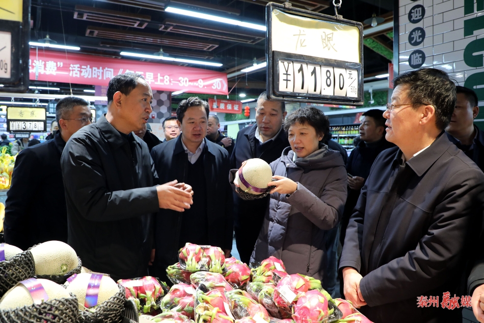 嘉佰乐超市内张灯结彩、年味十足。康泰来、王志成详细了解商品供应、销售渠道、价格变化和日常管理等情况。康泰来、王志成指出,“米袋子”“菜篮子”事关民生福祉。要密切关注节日市场运行情况,全力保障重要农副产品的产销保供,强化市场监测、运行分析和预测预警,确保数量充足、品种丰富、质量放心、价格稳定,切实保障人民群众“舌尖上的安全”。要严格落实消防安全责任,加大风险隐患排查整治力度,增强商户安全意识和应急处置能力,全力保障人民群众生命财产安全。
