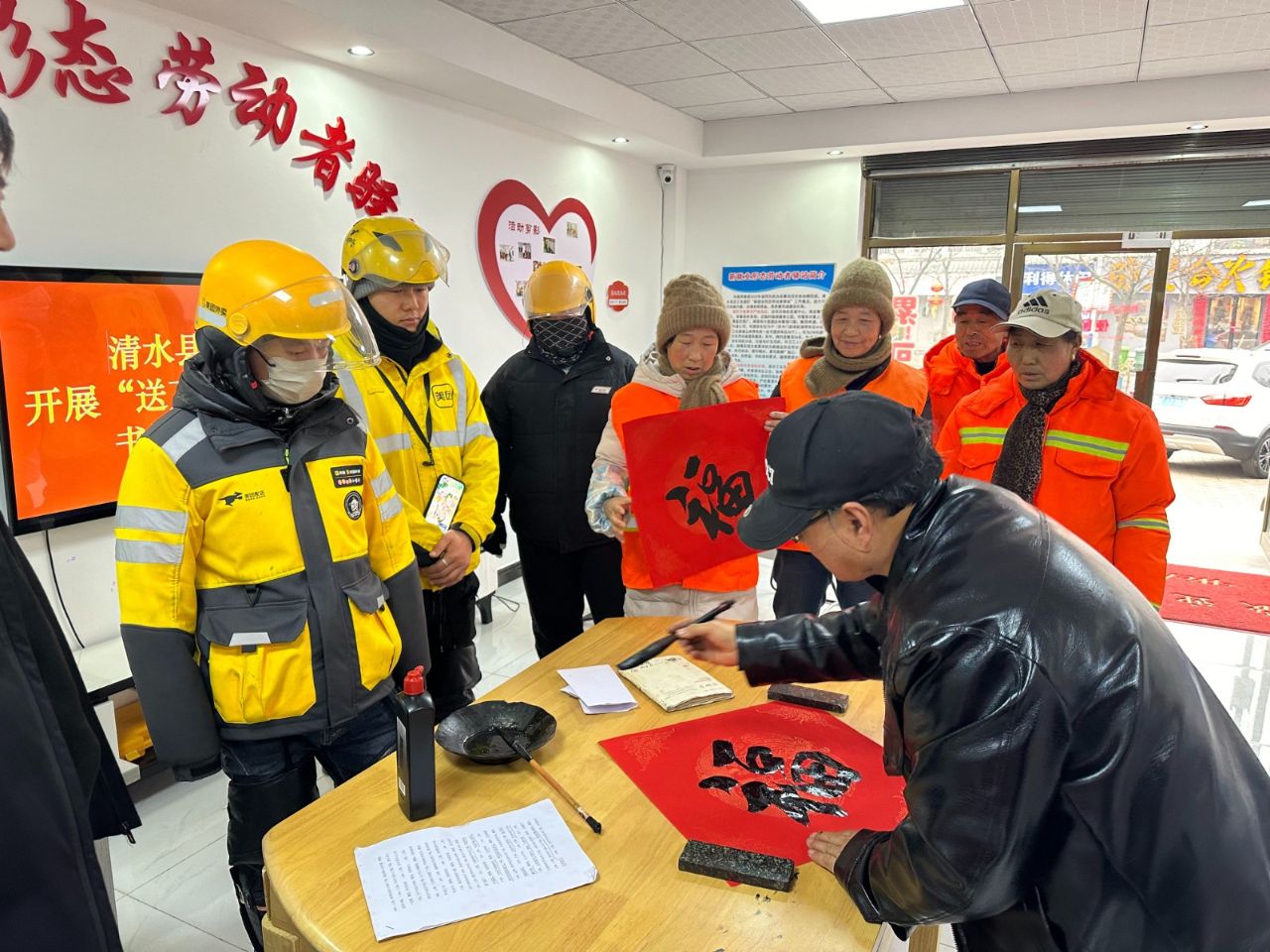 新天水讯 据清水县融媒体中心消息 春节临近,年味愈浓。为弘扬传承中华传统文化,传递工会关怀,共同营造喜庆和谐的节日氛围,1月23日,清水县总工会“送万福、进万家”书法公益活动在新就业形态劳动者驿站拉开序幕,邀请书法爱好者现场为新就业形态劳动者及户外劳动者书写、赠送了春联和“福”字,将新春祝福送到他们身边。