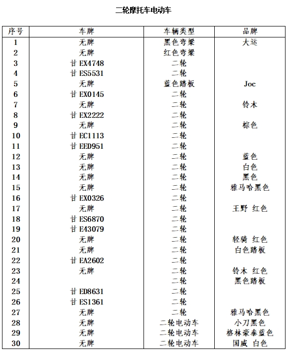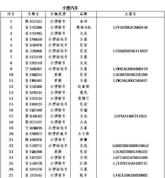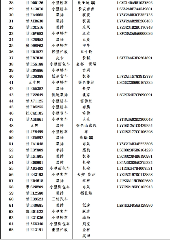 甘谷县公安局交警大队现将以下长期未处理车辆予以公告。在公告期内,车辆所有人持有效证件前往甘谷县公安局交警大队办理相关手续。自公告15日内不处理的,将依据《中华人民共和国道路交通安全法》相关之规定予以强制报废。