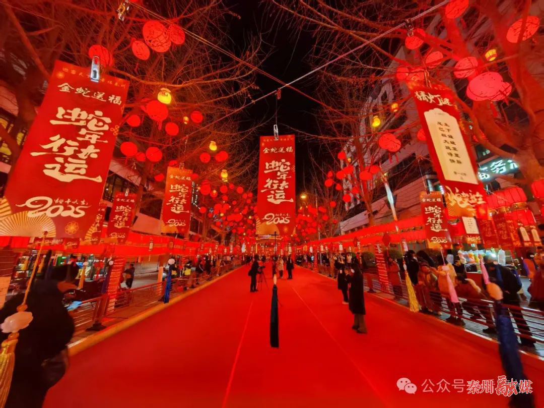 华灯初上,青年北路入口处,一条百米长的红毯从街头蜿蜒至街尾,街道两侧一排排红彤彤的灯笼鲜艳喜庆,透着浓浓的新春气息。在大红灯笼的映衬下,一张张写满谜语的灯谜牌随风轻舞,仿佛在向过往的行人招手。