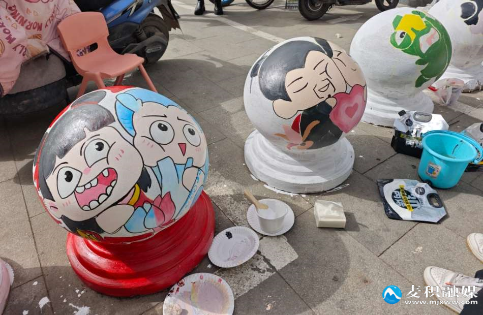 彩绘现场,老师们手持画笔,精心勾勒线条,细致填充色彩。在他们的妙手下,一个个原本单调乏味的石球发生了神奇的变化,摇身一变成为了色彩斑斓、形象鲜活的“艺术小品”。