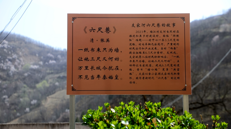 2023年,梅江村支家河自然村在建设和美乡村的过程中,支双成等8位村民积极响应村“两委”的号召,主动拆让自家院落,将原本3.5尺的巷道拓宽至6.5尺宽,由此,改善了村庄内的道路交通环境,让大家的出行更通畅,更便捷,更重要的是,也让谦逊礼让,以和为贵的美德深深地厚植于村民心中,浸润到了支家河村的各个角落。