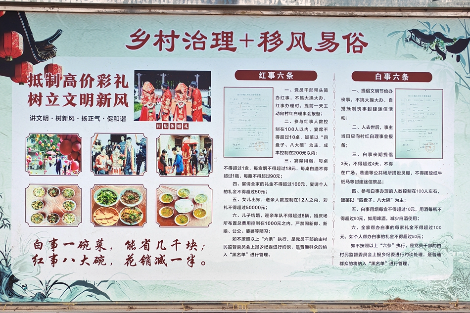 贾川乡梅江村第一书记陈文科说:“我们梅江村构建了以‘法治保障、德治教化、自治强基’的‘三治’融合治理体系,多形式开展‘主题党日+新时代文明实践’活动,创新设立‘红白事六条’、‘大槐树讲坛’、‘家风家训教育基地’、‘五老说事室’、‘积分清单制’五种治理模式,形成了共建共治共享新格局。”