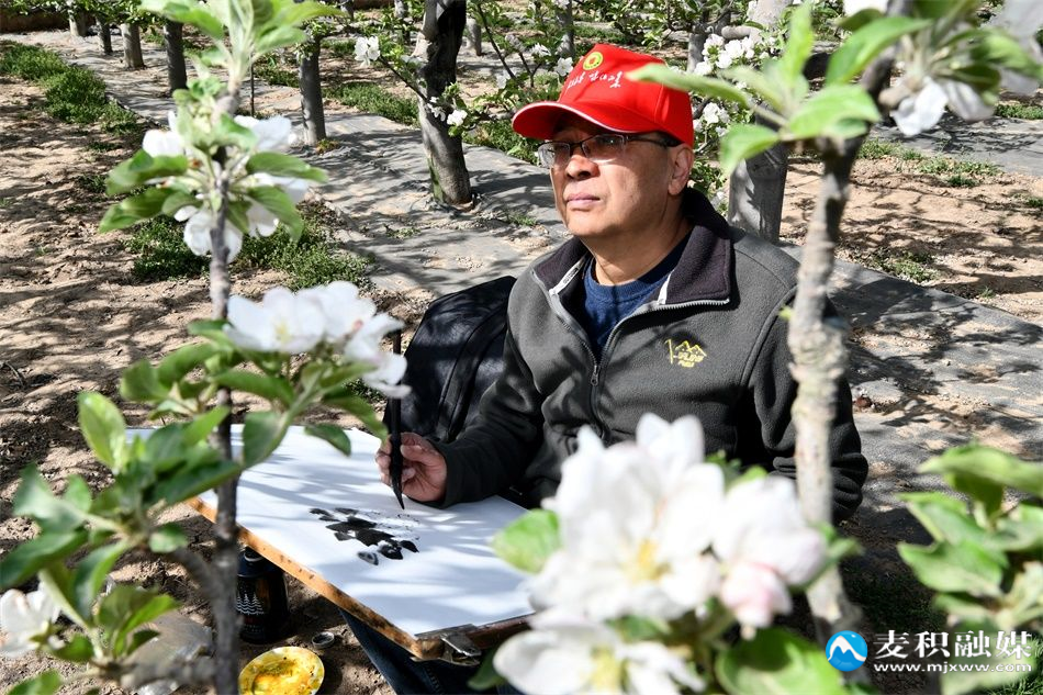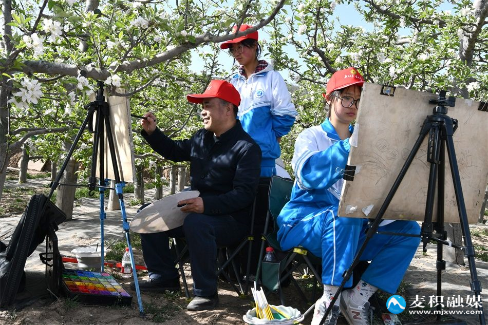 写生采风现场,画家们用丹青妙笔,将苹果基地的田园风光和苹果花开的娇艳之美倾注笔端,创作出了一幅幅绚丽多彩的画作;作家、诗人们则走进果园,感受田园诗意,捕捉创作灵感,赋诗作曲,讴歌新时代、赞美新生活,表达对麦积美好未来的无限憧憬。