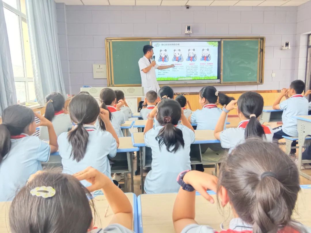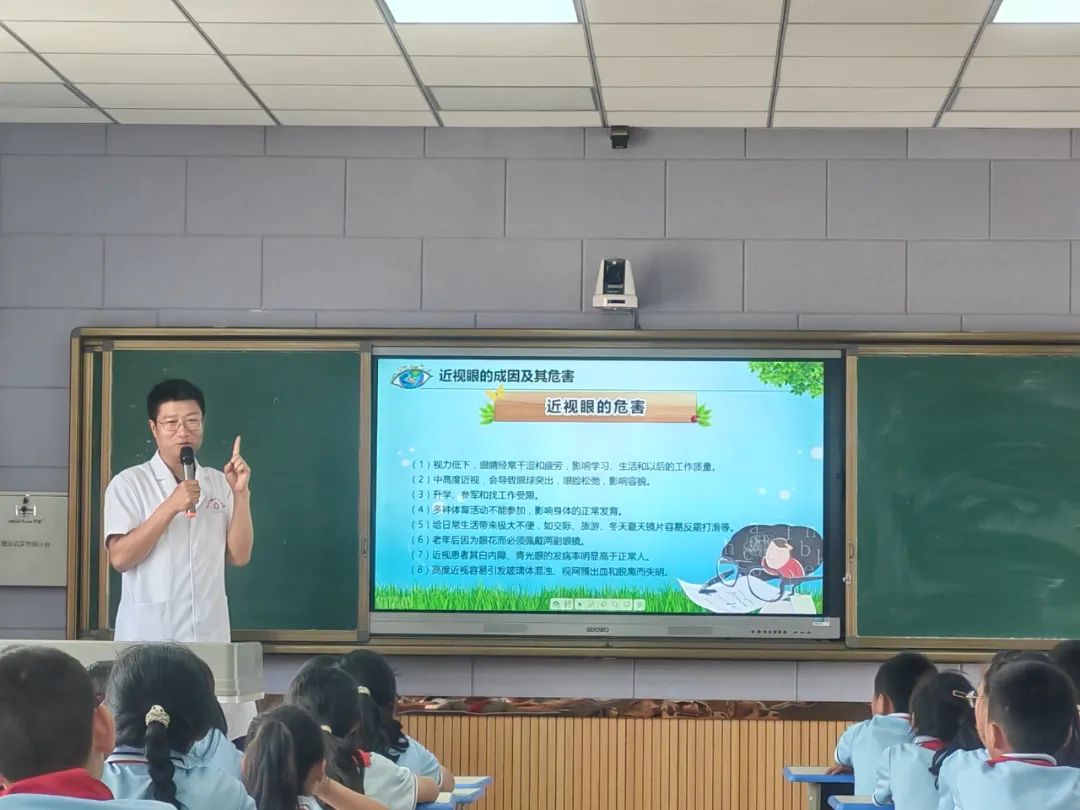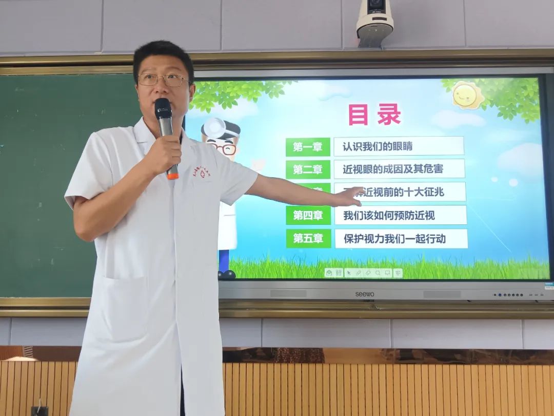 我院眼科专家赵威风作为主讲为同学们详细讲解眼科知识,结合青少年常见的眼部问题,用通俗易懂的语言,从近视的成因、危害到预防措施,进行了深入浅出的讲解。他指出,随着电子产品的普及和学业压力的增加,青少年近视率逐年上升。长时间近距离用眼、缺乏户外活动、不良的读写姿势等都是导致近视的重要因素。专家们详细介绍了科学用眼的方法,如连续用眼时间不宜超过40分钟,每用眼40分钟应休息10 - 15分钟,可通过远眺、做眼保健操等方式放松眼睛;每天保证2小时以上的户外活动,让眼睛充分接触自然光线;保持正确的读写姿势,做到“一拳、一尺、一寸”。